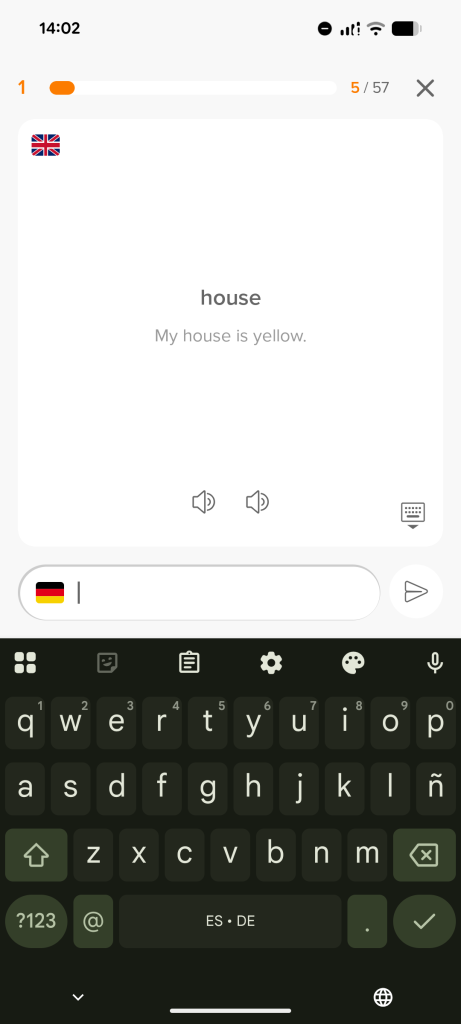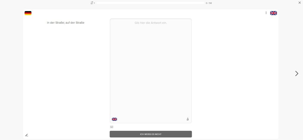 Die Zahl oben rechts zeigt dir an, in welcher Phase sich das Kärtchen befindet. Du siehst auch, dass du je nach Sprache die Möglichkeit hast besondere Schriftzeichen einzufügen. Unten links kannst du in der Abfrage immer den kleinen Stift anklicken – hierüber können dem Kärtchen Notizen hinzugefügt werden.