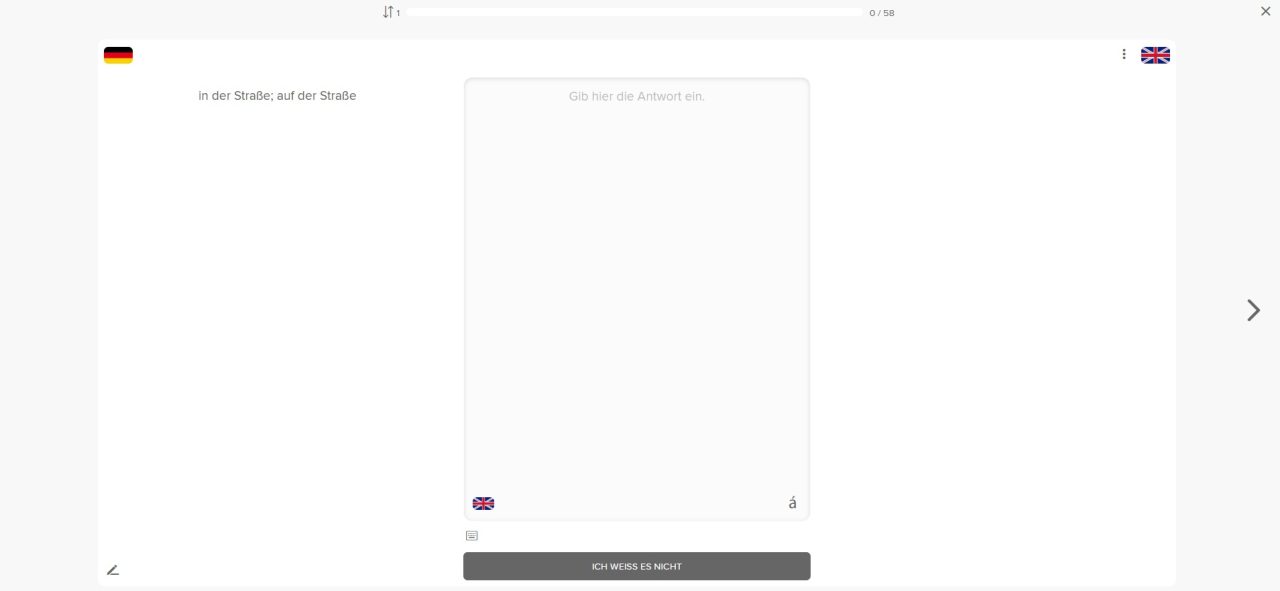 Bist du dir bei einem Kärtchen sehr unsicher, kannst du es mit dem kleinen Pfeil rechts neben dem Kärtchen auch zunächst überspringen. Das Kärtchen wird zu einem späteren Zeitpunkt innerhalb derselben Abfragerunde dann erneut vorgelegt.