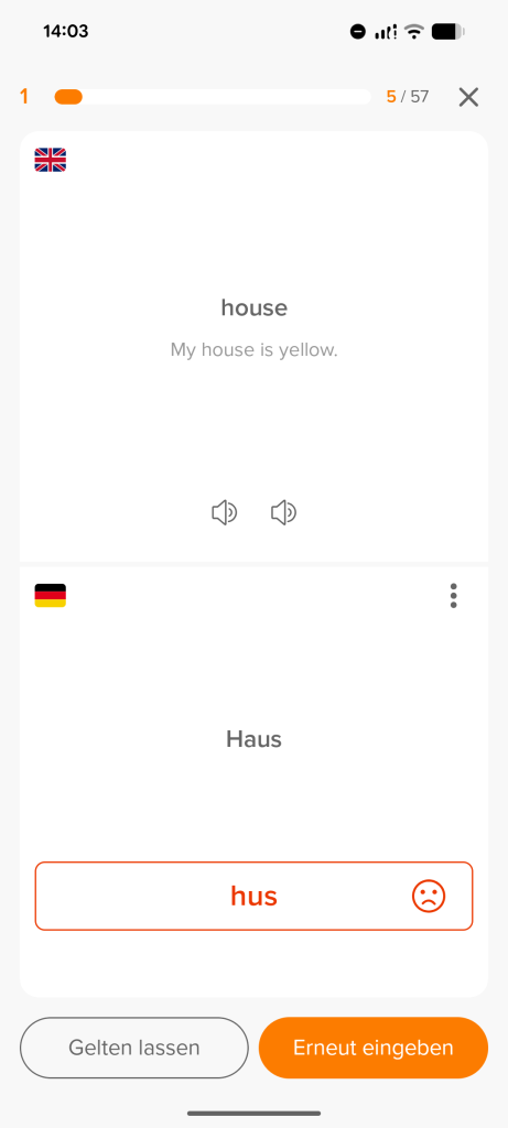 Hast du nun für ein Kärtchen eine Antwort eingegeben, siehst du zum Vergleich die Lösung. Je nach Lerninhalt werden eventuell weitere Informationen angezeigt (z.B. Satzzeichen, Lautschrift, Vertonung, Beispielsätze).