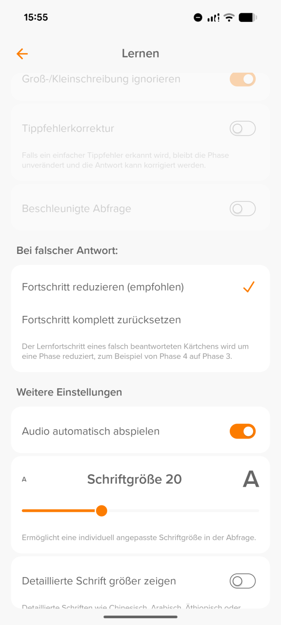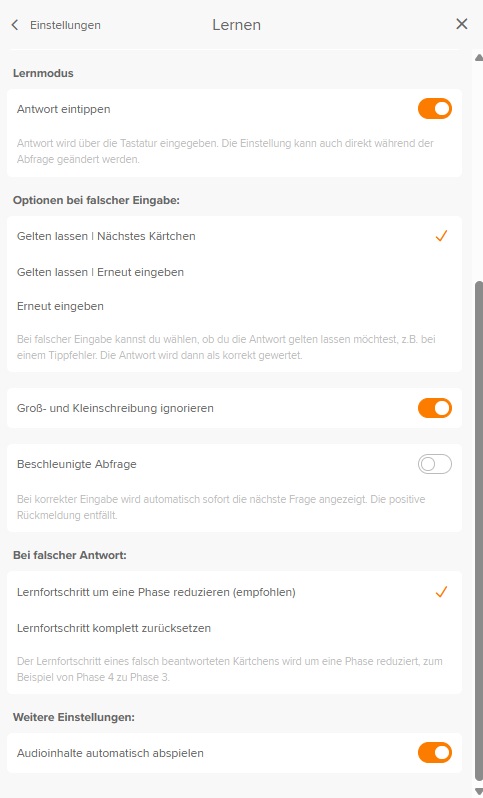 Mit der Optionen bei falscher Antwort, kannst du auswählen, was dir bei falscher Antwort angezeigt wird. Du hast zur Auswahl: Gelten Lassen / Nächstes Kärtchen, Gelten Lassen / Erneut eingeben oder Erneut eingeben.