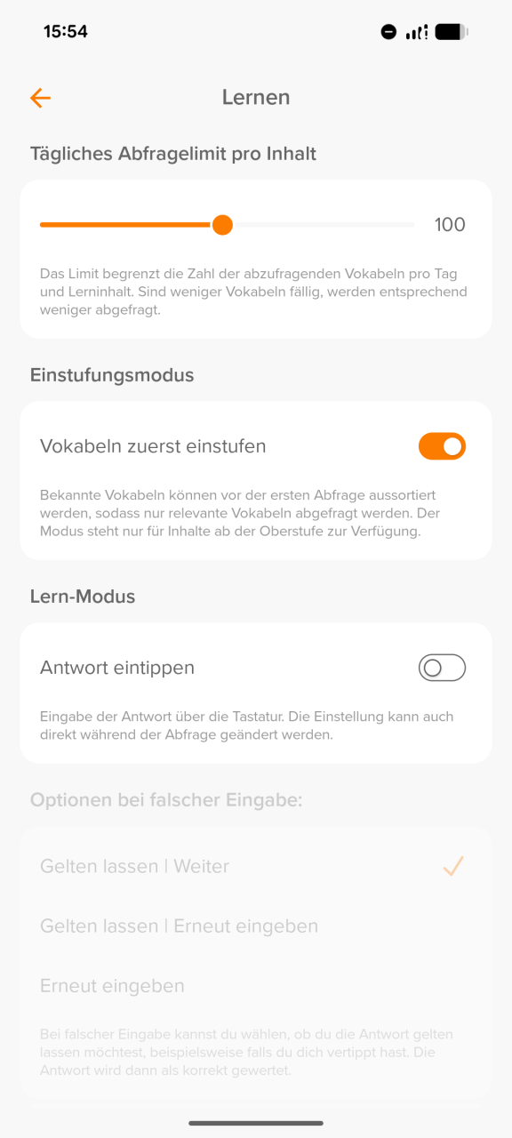 Die Option Antwort eintippen ermöglicht die Eingabe der Antwort über die Tastatur. Die Einstellung legt fest, dass die eingegebene Antwort exakt mit der vorgesehenen Antwort übereinstimmen muss. Sofern vorhanden, müssen z.B. auch Satzzeichen oder Grammatikangaben mit eingegeben werden. Standardmäßig ist diese Option deaktiviert. Aktivierst du diese, öffnen sich weitere Optionen: Gelten Lassen / Nächstes Kärtchen, Gelten Lassen / Erneut eingeben, Erneut eingeben.