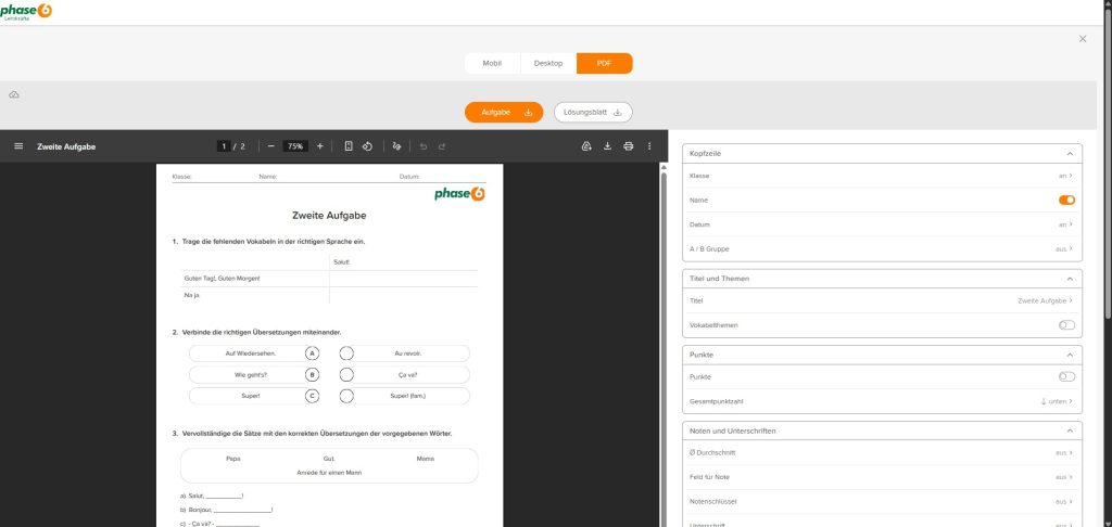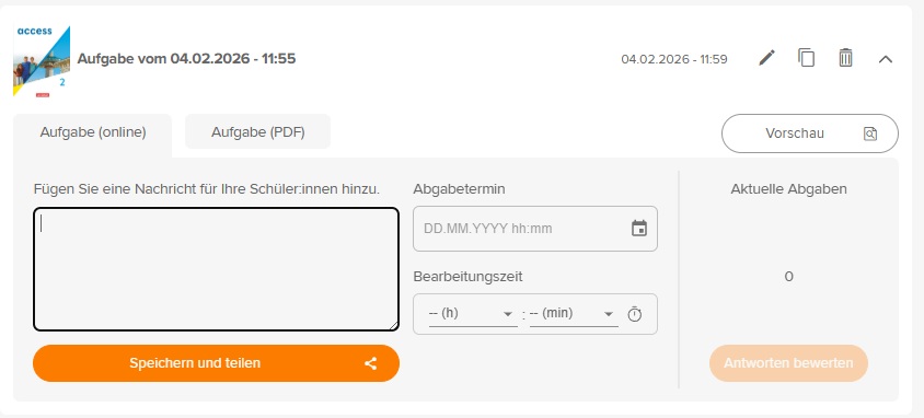 Die Aufgabe können Sie in Form eines PDFs ausdrucken und bearbeiten lassen oder auch online. Der Abgabetermin und die Bearbeitungszeit können optional festgelegt werden.