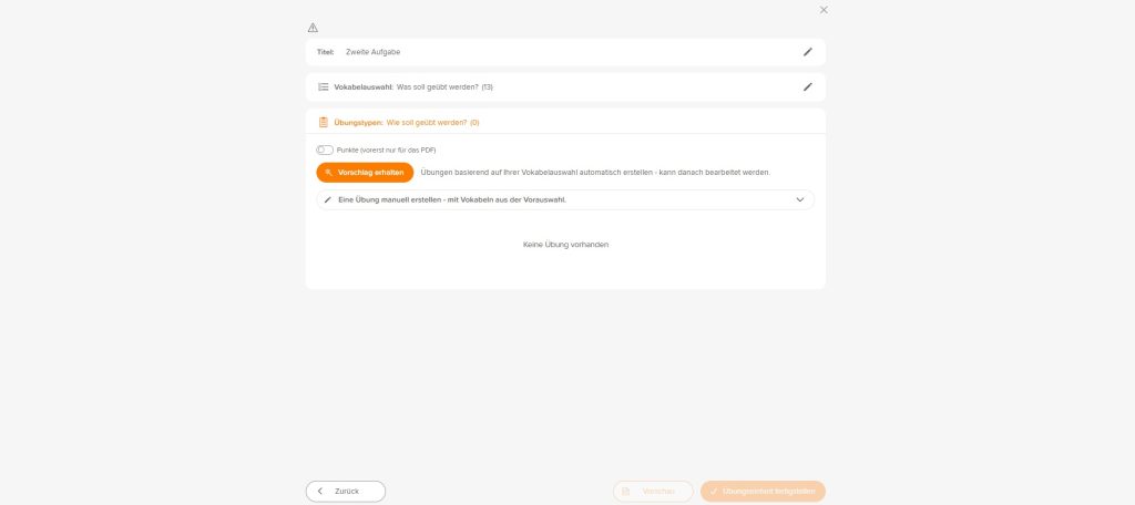 Um noch mehr Zeit bei der Erstellung der Aufgabe zu sparen, können Sie sich einen automatischen Vorschlag erstellen lassen, den Sie im Anschluss individualisieren können. Klicken Sie bei der Übungsauswahl dafür auf den Button “Vorschlag erhalten”. Im Hintergrund werden nun die von Ihnen gewählten Vokabeln zufällig verschiedenen Übungstypen zugeordnet. Die Anzahl der Übungen ist abhängig von der Anzahl der zuvor gewählten Vokabeln. Sie werden anschließend auf die Zusammenfassungsseite geleitet und können dort die Übungen nach Bedarf anpassen. Um einen neuen Vorschlag zu erhalten, klicken Sie auf “Neuer Vorschlag”.